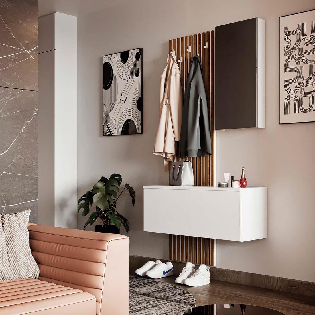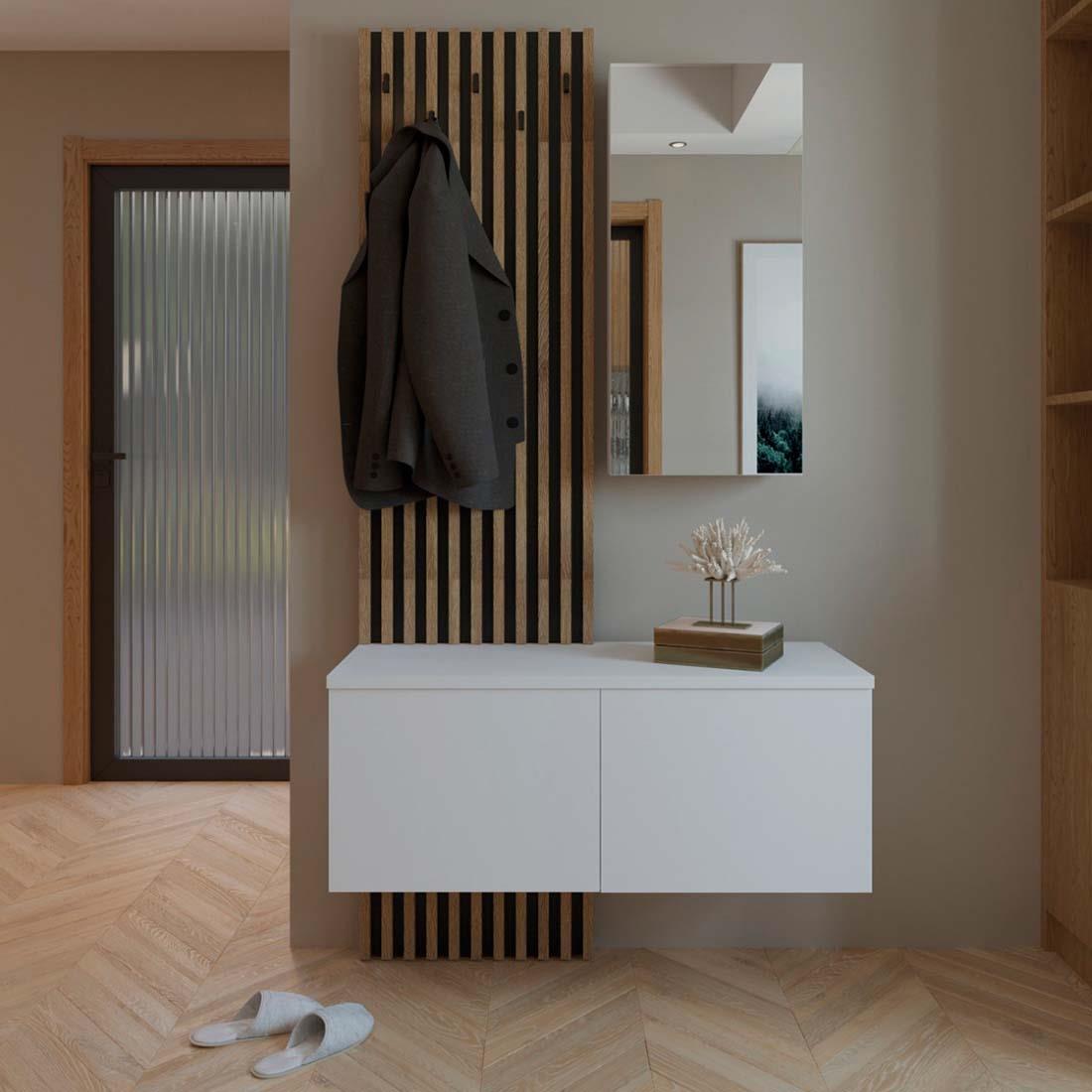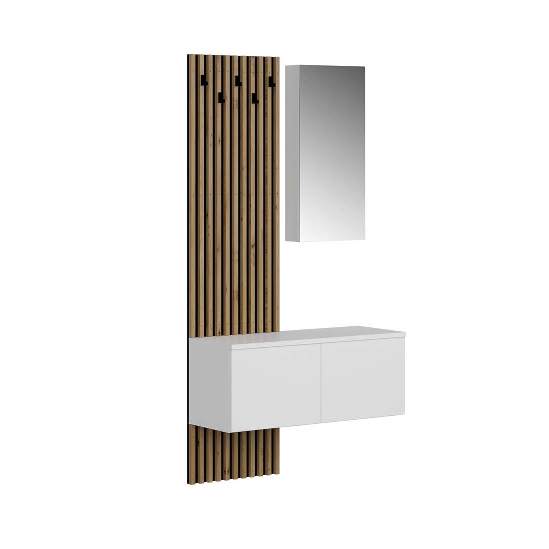 El recibidor Arika destaca por su diseño funcional y contemporáneo con el que podrás decorar y organizar tu espacio. Incorpora un natural panel de tablillas verticales en madera, combinado con un módulo alto con espejo decorativo y un mueble bajo suspendido con dos puertas. Fabricado en aglomerado recubierto de melamina, en acabado blanco-tablilla.