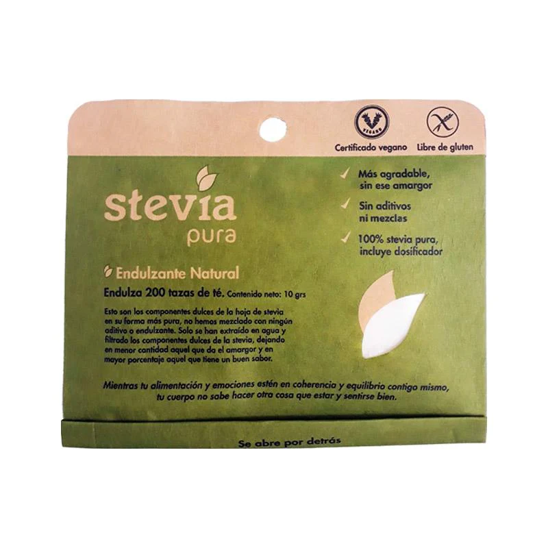 La stevia pura tiene un sabor agradable y es menos amarga, pero no significa que la hemos mezclado con algún químico u otro endulzante, sino que se ha vuelto a filtrar para dejar en menor cantidad el componente amargo de la hoja y en mayor cantidad el componente dulce de la hoja que tiene buen sabor.